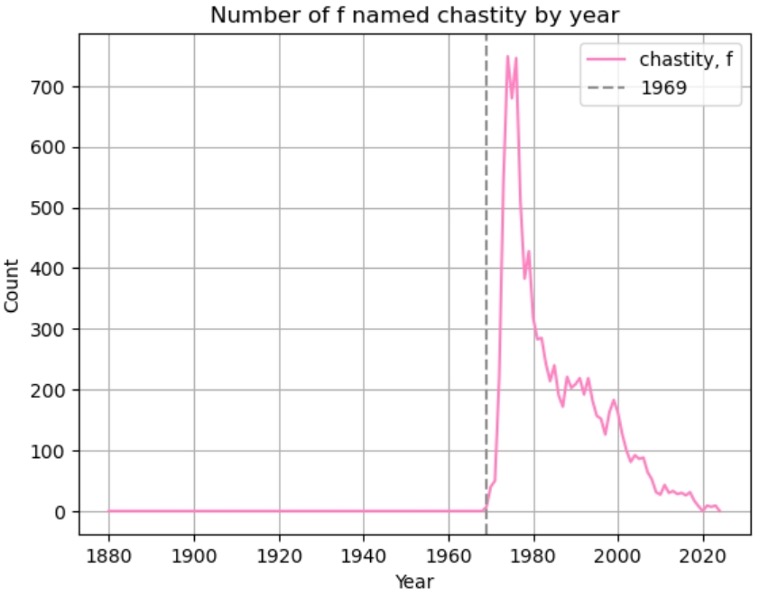 A few months later, I was suddenly curious about Puritan virtue names and looking at which ones were still in use. I found a list on a name website and looked up each one in the US name data, writing down the ones that had sharp increases in popularity. One of those names was Chastity. Prior to 1969, there was no data for Chastity, meaning that from 1880 to 1968 there were no more than five in any year. Shown is the graph of the number of girls named Chastity.